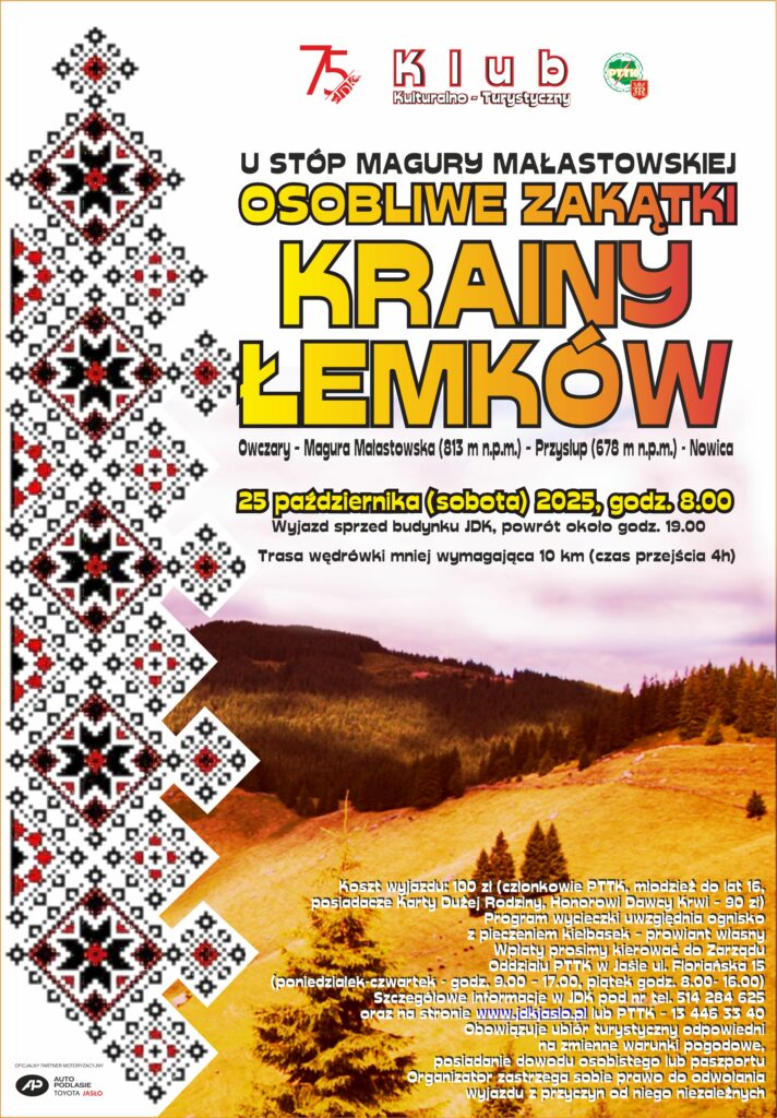 Owczary, Magura Małastowska, Przysłup i Nowica – taki szlak będą mieli okazję pokonać uczestnicy kolejnej jesiennej wycieczki organizowanej przez Klub Kulturalno-Turystyczny Jasielskiego Domu Kultury oraz jasielski oddział Polskiego Towarzystwa Turystyczno-Krajoznawczego. Wyjazd zaplanowano na sobotę, 25 października 2025 roku. Autokar wyruszy sprzed siedziby JDK o godz. 8.00, a powrót przewidywany jest około godz. 19.00.