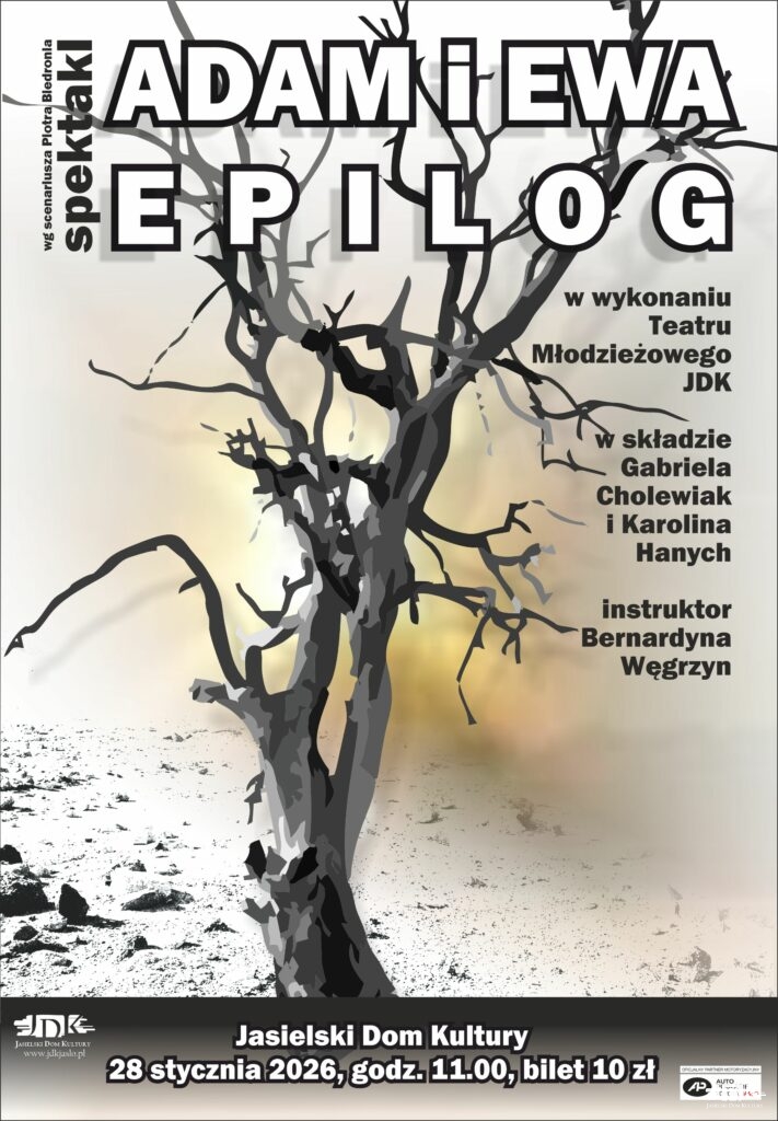 Zapraszamy na wyjątkowy spektakl „Adam i Ewa: Epilog” w wykonaniu Teatru Młodzieżowego Jasielskiego Domu Kultury (JDK) pod kierunkiem Bernardyny Węgrzyn. Przedstawienie, które powstało na podstawie scenariusza filmowego Piotra Biedronia, odbędzie się 28 stycznia 2026 r. o godz. 11:00 w sali widowiskowej JDK.