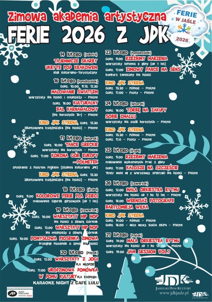 „Zimowa Akademia Artystyczna – Ferie 2026 z JDK” to propozycja dla mieszkańców Jasła i regionu, którzy chcą spędzić ferie zimowe aktywnie i kulturalnie. Na większość zajęć obowiązują wcześniejsze zapisy, a liczba miejsc jest ograniczona.