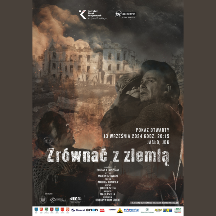 Film „Zrównać z ziemią” zostanie zaprezentowany w 80. rocznicę wysiedlenia i zburzenia miasta. 13 września 2024 r. w Jasielskim Domu Kultury o godzinie 20:15 odbędzie się pokaz otwarty dla mieszkańców. Podczas uroczystości chcemy oddać hołd mieszkańcom walczącym o wolność. Wejściówki do odebrania w sekretariacie JDK.