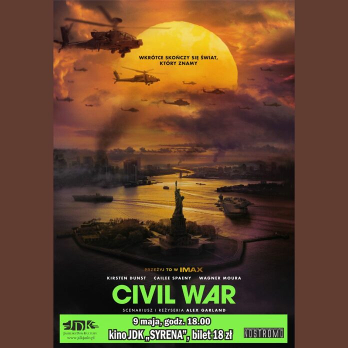 Napędzane adrenaliną i trzymające w napięciu kino akcji osadzone w niedalekiej przyszłości, kiedy podzielona Ameryka zmierza ku dziejowej katastrofie. Stany Zjednoczone balansują na krawędzi upadku. Skorumpowany prezydent wzywa obywateli do walki przeciwko „sojuszowi z Florydy i zachodnim siłom Teksasu i Kalifornii”. Fotografka wojenna Lee (Kirsten Dunst) wraz z grupą dziennikarzy próbuje dostać się do Waszyngtonu, będącego epicentrum dramatycznych wydarzeń, by przeprowadzić ostatni wywiad z prezydentem. W tej misji towarzyszy im ambitna, lecz niedoświadczona dziennikarka Jessie (Cailee Spaeny). Lee, mimo początkowej niechęci, zostaje jej mentorką. Garland stworzył nowy rodzaj amerykańskiego filmu wojennego: to nie jest tylko przerażająca wizja jutra, to również szczery do bólu obraz prawdziwej wojny. W obsadzie filmu obok Kirsten Dunst („Psie pazury”, „Na pokuszenie”) znaleźli się Cailee Spaeny („Priscilla”), Wagner Moura („Narcos”), Stephen McKinley Henderson („Diuna”) oraz Jesse Plemons („Czas krwawego księżyca”).