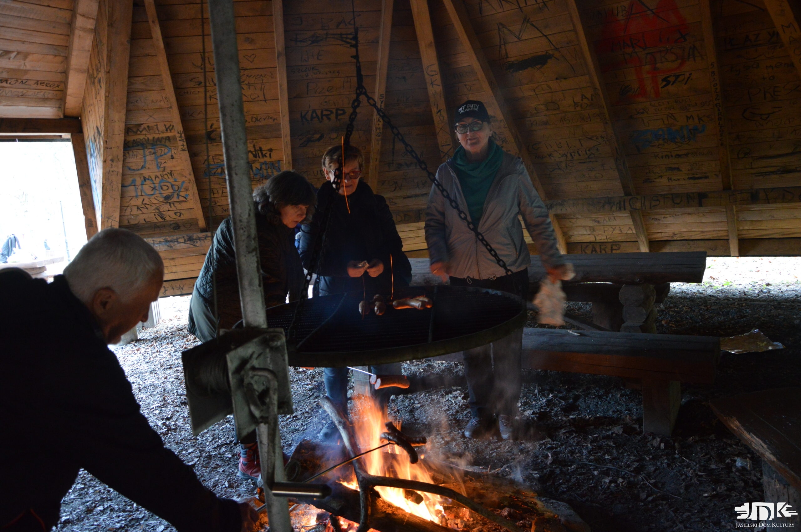Folusz- wiata ogniskowa- uczestnicy pieką kiełbaski