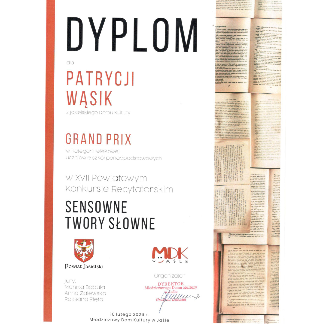 Z ogromną radością informujemy, że Patrycja Wąsik – podopieczna Jasielskiego Domu Kultury (JDK), uczestniczka sekcji Teatru Młodzieżowego prowadzonej przez Bernardynę Węgrzyn – zdobyła Grand Prix w kategorii „uczniowie szkół ponadpodstawowych” w konkursie „Sensowne Twory Słowne”, organizowanym przez Młodzieżowy Dom Kultury w Jaśle.