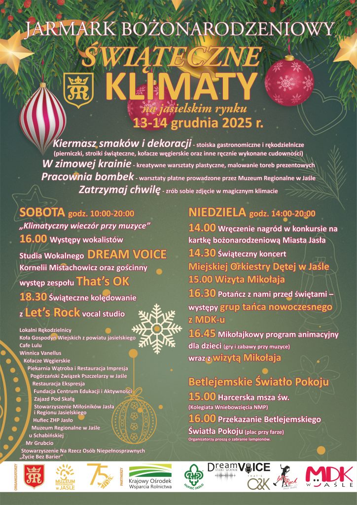 W programie wydarzenia nie zabraknie również muzycznych akcentów. Zarówno w sobotę, jak też w niedzielę, na jasielskim rynku zabrzmią melodie najpopularniejszych świątecznych piosenek oraz kolęd. Pierwszego dnia jarmarku, na scenie wystąpią wokaliści Studia Wokalnego DREAM VOICE Kornelii Mistachowicz, zespół That’s O&K oraz wokaliści studia wokalnego Let’s Rock, którzy zaprezentują własne aranżacje najpiękniejszych kolęd. W niedzielę na jasielskim rynku zabrzmią świąteczne melodie w wykonaniu Miejskiej Orkiestry Dętej w Jaśle. Dodatkową atrakcją będzie występ grup tańca nowoczesnego z Młodzieżowego Domu Kultury w Jaśle.