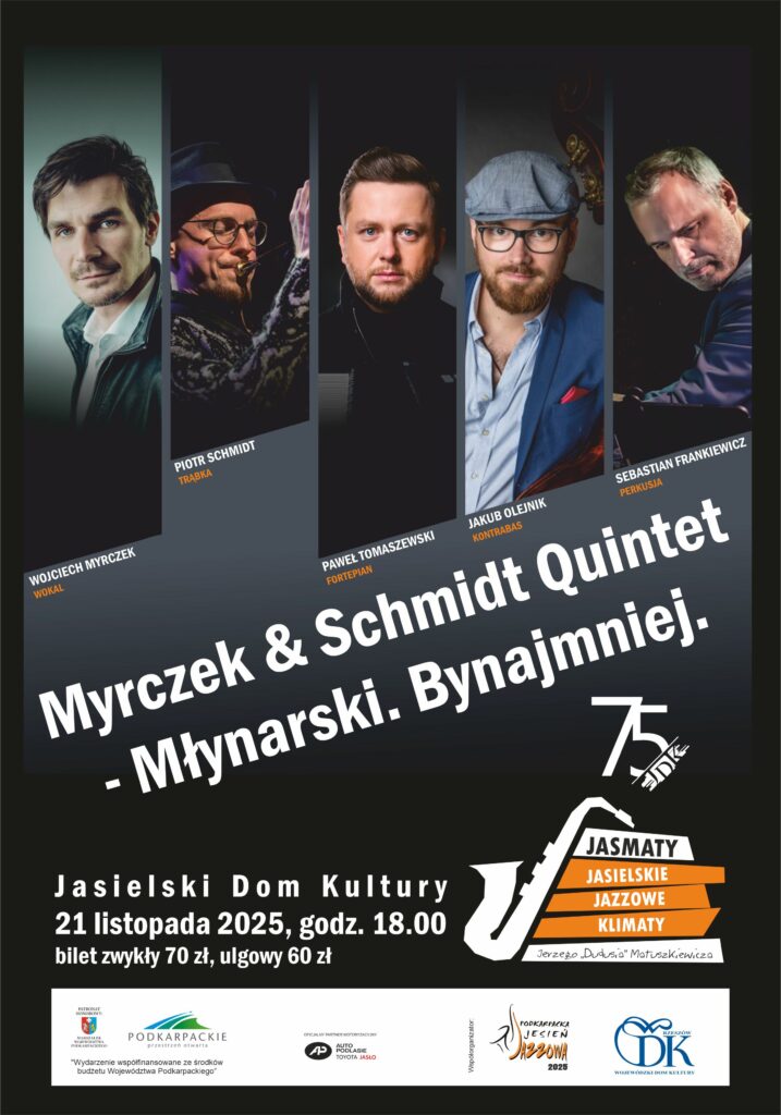 Koncert w wykonaniu Myrczek & Schmidt Quintet to nowy projekt muzyczny ze wyśmienitymi aranżacjami Krzysztofa Herdzina i Sabiny Meck do tekstów Wojciecha Młynarskiego. Premiera tego albumu odbyła się 4 grudnia 2024 r., a 21 listopada br. będzie można usłyszeć materiał na żywo, podczas koncertu w ramach JasMatów – Jasielskich Jazzowych Klimatów im. Jerzego „Dudusia” Matuszkiewicza. Bilety w cenie 70 zł (zwykły) i 60 zł (ulgowy) do nabycia w sekretariacie JDK lub on line.