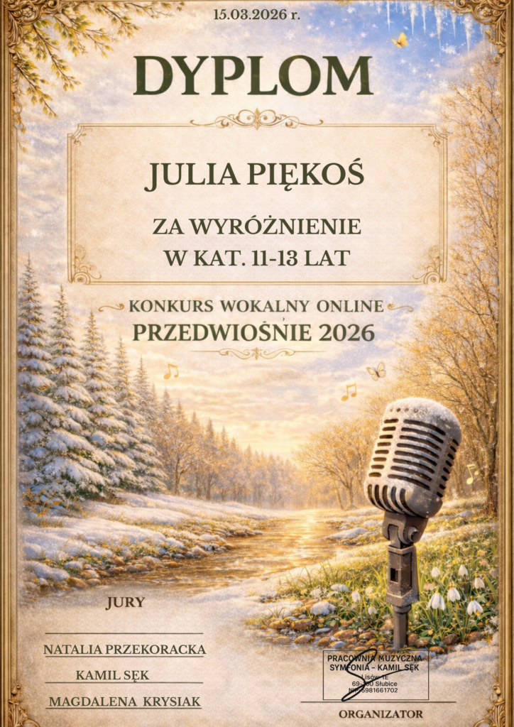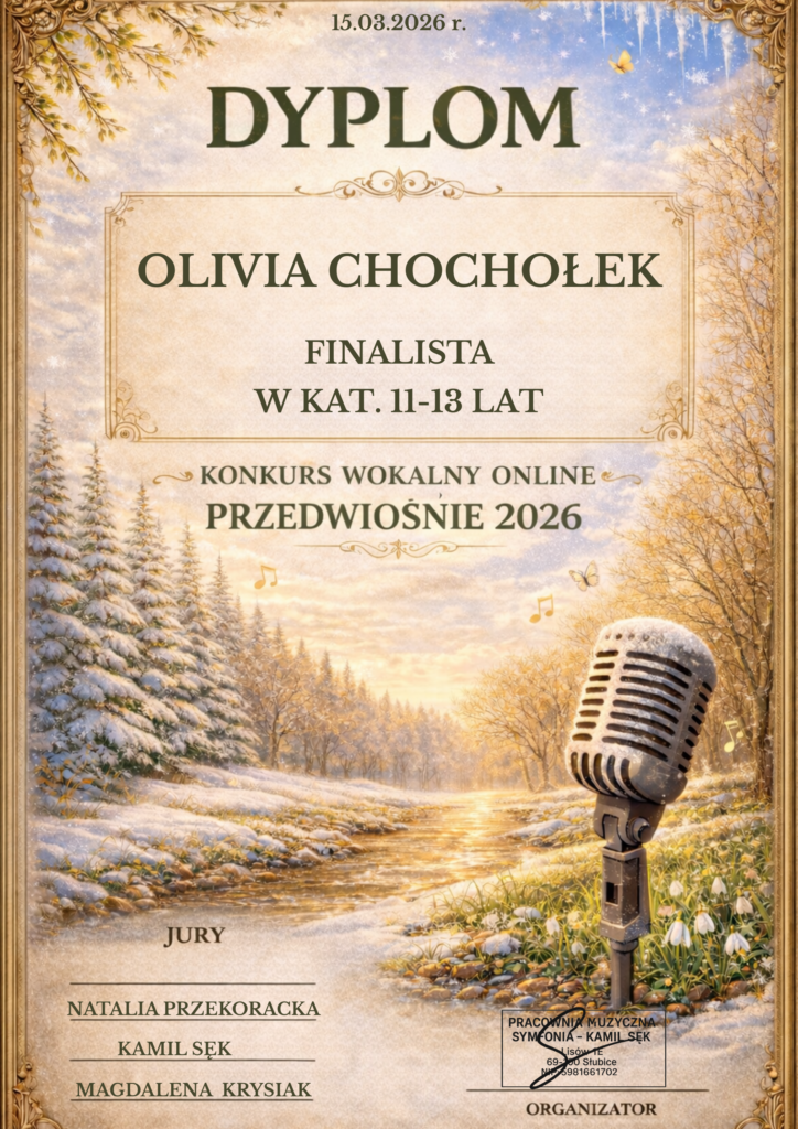 Celem konkursu jest nie tylko rywalizacja, lecz także budowanie motywacji i satysfakcji z artystycznego rozwoju. Tegoroczna edycja przeprowadzona na przełomie lutego i marca wyłoniła najlepszych w czterech kategoriach wiekowych. Wśród nagrodzonych i wyróżnionych znalazły się wspomniane już Olivia Chochołek oraz Julia Piękoś, uczęszczające na zajęcia śpiewu do Aleksandry Cieślik.