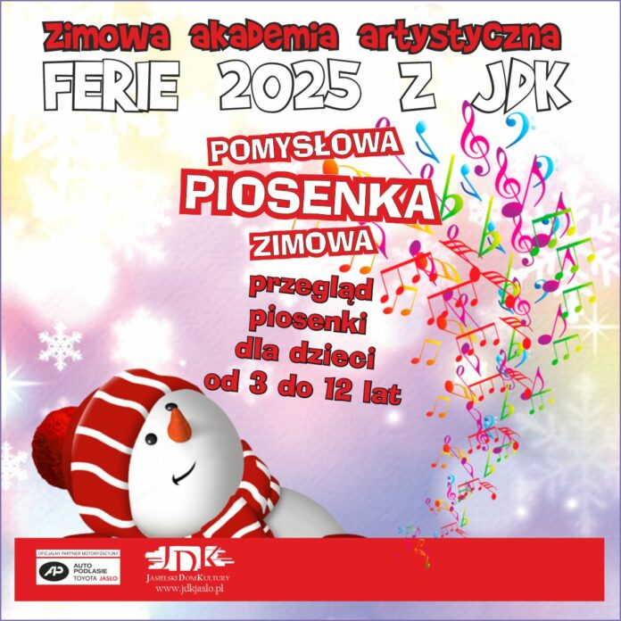 Dzieci w wieku od 3 do 12 lat zapraszamy do udziału w przeglądzie piosenek o zimie. Wprawdzie za oknem szaro i ciepło, ale zima kalendarzowa wciąż jeszcze trwa. Przygotujcie więc swoje prezentacje z pomysłem i zaśpiewajcie o zimie najpiękniej jak potraficie. Na Wasze zgłoszenia czekamy do 18 lutego 2025 r., zaś przegląd odbędzie się 21 lutego br. w Jasielskim Domu Kultury.