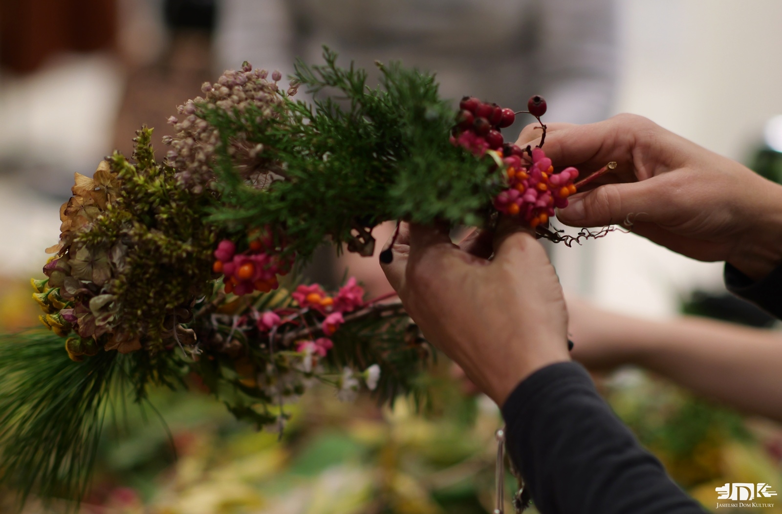 W czwartkowe popołudnie, 30 października br. w Jasielskim Domu Kultury odbyły się relaksacyjne warsztaty „Jesienne wicie wianków”. Spotkanie poprowadziła znana już ze swojej twórczości sympatykom JDK Iwona Bródka, rękodzielniczka i autorka projektu „Dusza na poddaszu”.