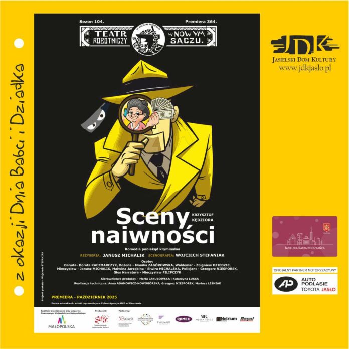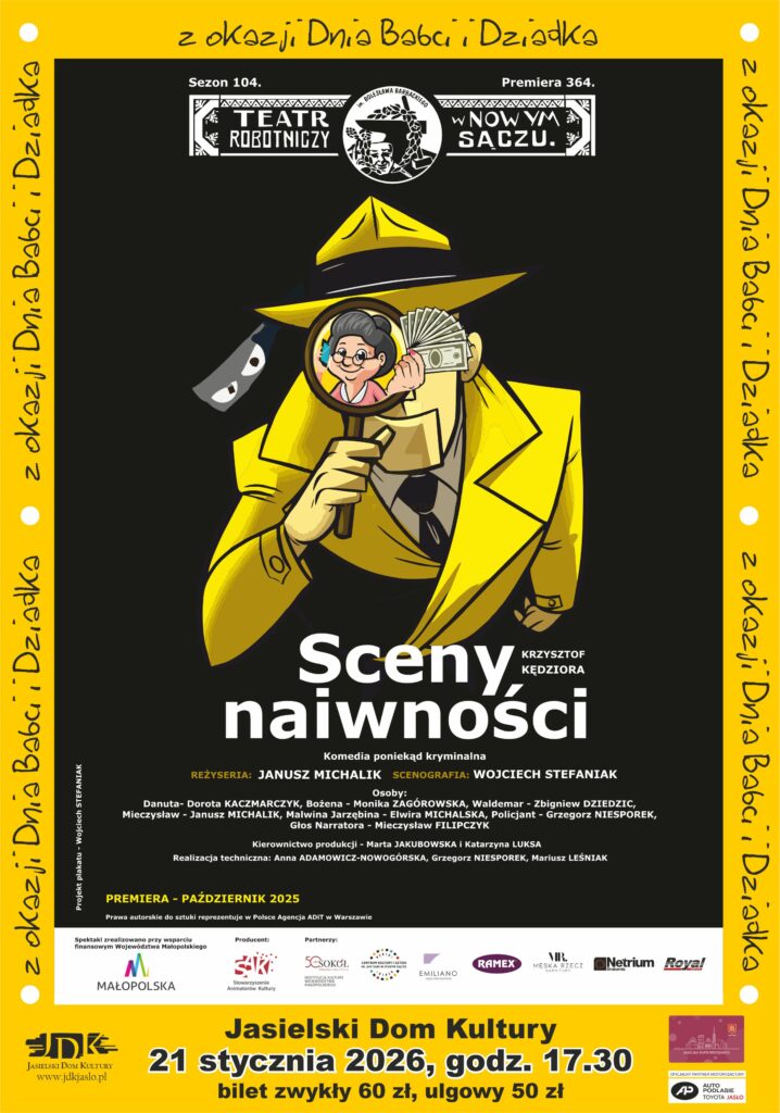 Teatr Robotniczy im. Bolesława Barbackiego w Nowym Sączu zaprasza na najnowsze przedstawienie pt. „Sceny naiwności” autorstwa Krzysztofa Kędziory. To dynamiczna i przewrotna komedia, która bawi, zaskakuje i skłania do refleksji nad współczesnymi zagrożeniami oraz ludzką łatwowiernością. Sztukę zobaczymy na scenie Jasielskiego Domu Kultury 21 stycznia 2026 r. o godz. 17.30. Bilety w cenie 60 zł (zwykły) i 50 zł (ulgowy) do nabycia w sekretariacie JDL lub online.