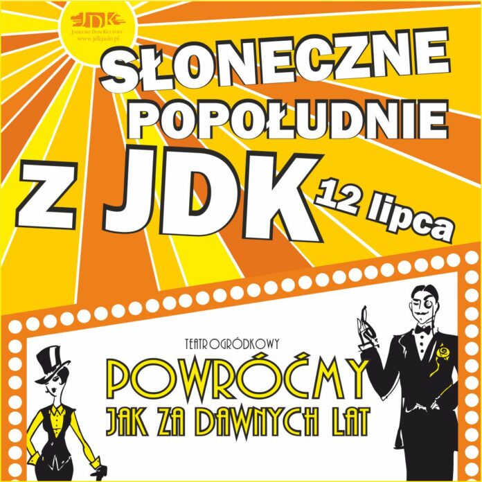 Atrakcje rozpoczynamy animacjami plastycznymi oraz pokazami tanecznymi na tarasie JDK, natomiast o godzinie 19.00 na młodzież czekają otwarte warsztaty hiphopowe. Dobra zabawa gwarantowana – wystarczy zabrać wygodne obuwie zamienne. Popołudnie zakończymy teatrem ogródkowym o godzinie 20.30 nucąc piosenki i opowiadając skecze 20-lecia międzywojennego. Program artystyczny „Powróćmy jak za dawnych lat” w wykonaniu Teatru JDK „Antrakt” zabierze widzów w wyjątkową podróż o zachodzie słońca.