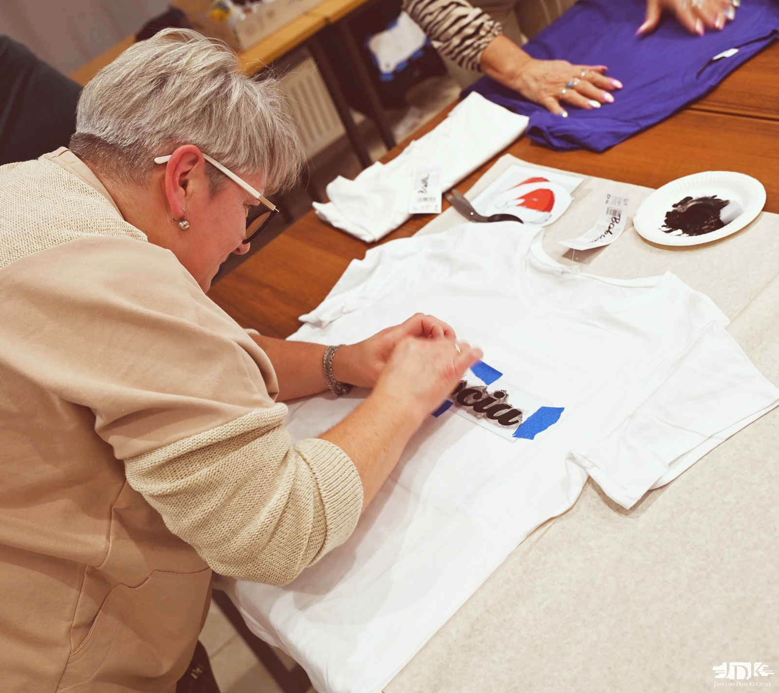 Podczas pracy nie zabrakło śmiechu, dobrej zabawy i twórczego eksperymentowania. Każda koszulka stała się małym dziełem sztuki, a jednocześnie pięknym prezentem – dla siebie lub dla bliskich. Nad całością czuwała – jak zwykle – nasza artystyczna dusza – Katarzyna Gądek-Smyka.