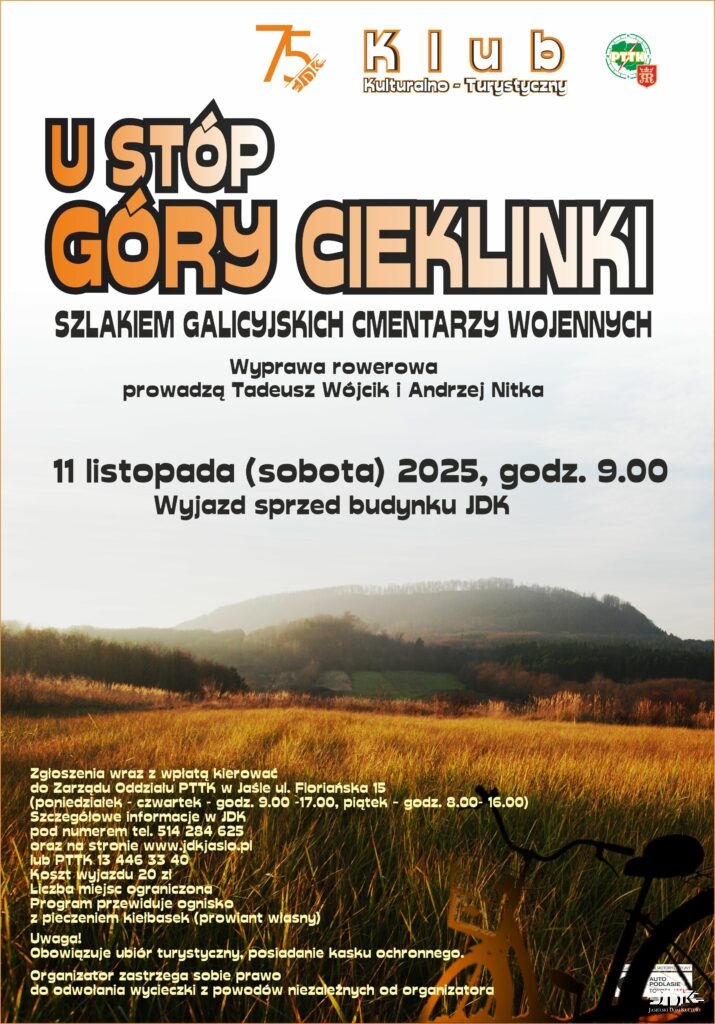 Klub Kulturalno-Turystyczny Jasielskiego Domu Kultury wraz z jasielskim oddziałem PTTK zapraszają do udziału w listopadowej wyprawie rowerowej. W sobotę, 11 listopada br., uczestnicy pokonają około 45 kilometrów, by odwiedzić miejsca pamięci narodowej związane z dramatycznymi wydarzeniami I wojny światowej.