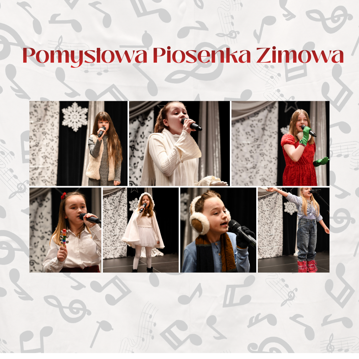 Podczas konkursu każdy uczestnik zaprezentował piosenkę o tematyce zimowej. Były występy z rekwizytami, barwne stroje i przemyślane interpretacje. Publiczność mogła podziwiać nie tylko odwagę sceniczną najmłodszych, ale także ich wrażliwość muzyczną i radość ze wspólnego śpiewania. Każdy występ był inny i wyjątkowy, a jury: Alicja Szulc i Marcelina Kamińska – nie miało łatwego zadania. Jednak po długiej naradzie, wyłoniono zwycięzców i nagrodzono ich możliwością nagrania utworu w studio nagraniowym JDK. Wszyscy uczestnicy otrzymali pamiątkowe dyplomy oraz upominki.